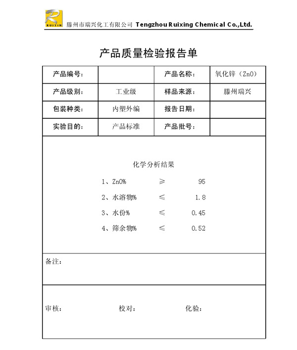 瑞興化工有限公司是生產(chǎn)氧化鋅的重點企業(yè),于2008年通過ISO9001:2008質(zhì)量管理體系認(rèn)證。“瑞興”牌氧化鋅在國內(nèi)擁有較大穩(wěn)定的市場,并遠銷東南亞、中東、中南美等國家和地區(qū),在國內(nèi)外享有較高聲譽。